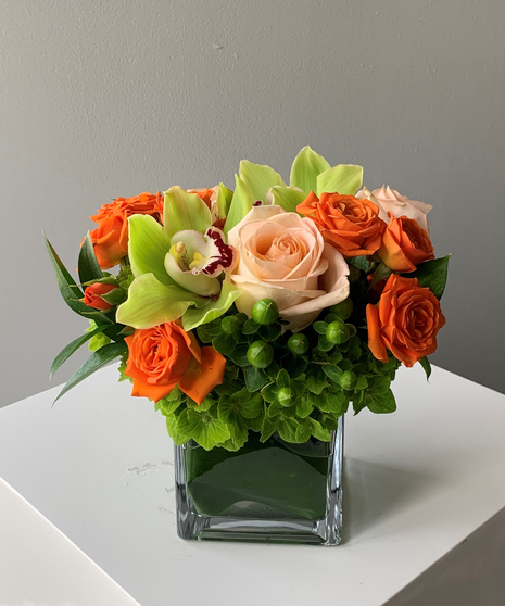 Contemporary elegance meets classic style with this stunning bouquet - roses, orchids and hydrangea arranged in a clear leaf lined glass square. Available in 2 sizes, deluxe (as shown), and premium. Need it right away? Same day delivery available throughout the Baltimore area!
