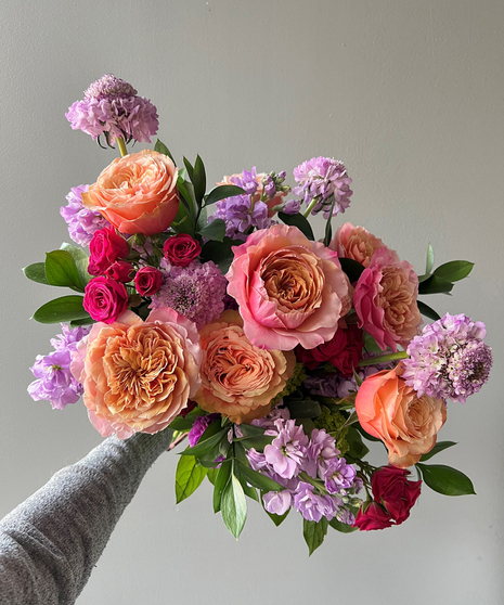 Our "Constance Gardener" is overflowing with rich, sherbet- toned garden roses and seasonal lavender blooms. Designed in a clear cylinder vase, this cheerful design is sure to impress a flower lover in your life.