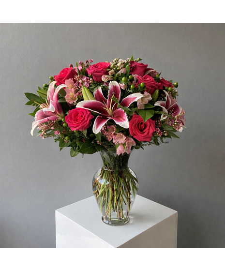 An Abundance of Roses, Lily's, Snapdragons, Waxflower, and Other Garden Flowers come together in an array of beautiful pink shades in a clear glass vase. Wow! your love with this gorgeous display.