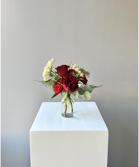A classic budvase adorned with garden red blooms and greenery to add a perfect little extra touch to your event. Perfect for the center of a small round table, interspersed around larger florals, next to your cake, or to decorate the bar!