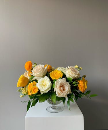 A large and lush classically styled vase featuring a blend of yellows and cream roses, vibrant greenery, and other textures. This stunning arrangement is available in 4 sizes, making it the perfect centerpiece for your upcoming event!