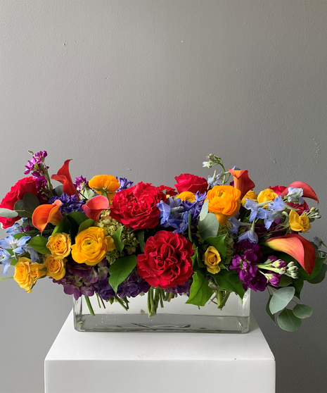 Our beautifully refreshing Long & Low Bright Centerpiece is the perfect seasonal centerpiece! Filled with purple hydrangea, muscari, stock, calla lilies, and more, this arrangement, available in two sizes, is sure to be an eye-catcher on your table. Need it right away? Same day delivery available throughout the Baltimore area!