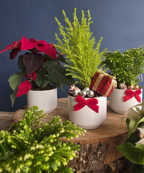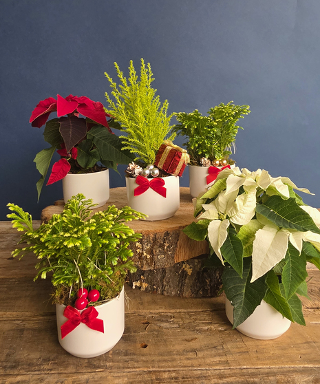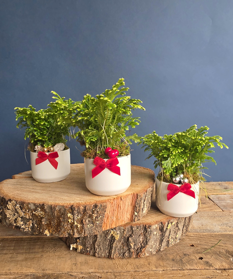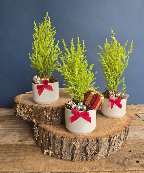 Each set includes three hand-selected winter plants, each potted in its own ceramic container and finished with seasonal accents like red velvet bows, ornaments, and/or pinecones. These mini delights bring a touch of holiday warmth to desks, countertops, bedside tables, and cozy nooks everywhere.