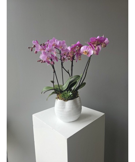 Multiple stems of orchids create a lively display of blooms, while the succulent adds texture and modern garden appeal at the base. Long-lasting and easy to enjoy, Orchid Charm is perfect for celebrating special moments or simply brightening someone’s day.