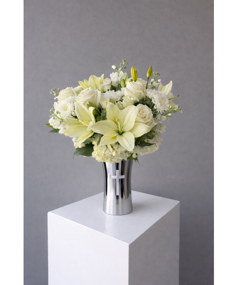 Presented in a sleek silver vase adorned with a refined cross detail, this piece captures both modern sophistication and meaningful symbolism. The polished finish enhances the glow of the florals while allowing the cross to stand as a subtle yet powerful expression of remembrance, hope, and spiritual connection.