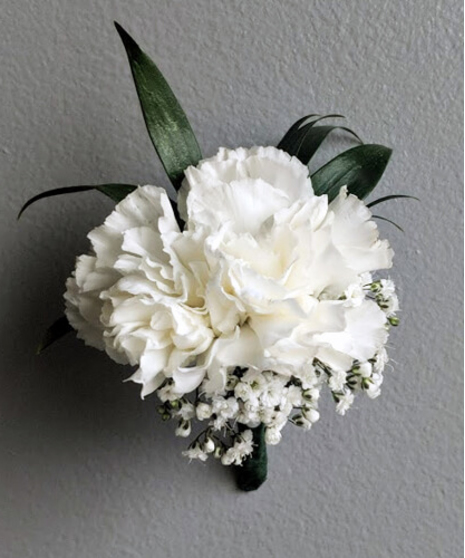 A classic carnation boutonniere is a great lapel adornment for your special dance! Available with baby's breath in White (as shown), Pink, Lavender, Purple or Red Carnations!