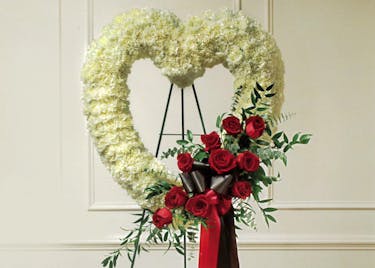 Show your sympathy and support with a beautiful tribute. Flowers such as red roses, white carnations and more adorn this open heart finished with satin ribbon.