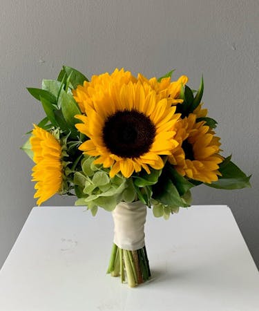 A gorgeous classically styled bouquet featuring cheerful sunflowers, antique hydrangea, and vibrant mix of greenery, hand-tied with a ribbon wrapped stem. Perfect for destination weddings, courthouse surprises, and romantic elopements.(No Vase Included)