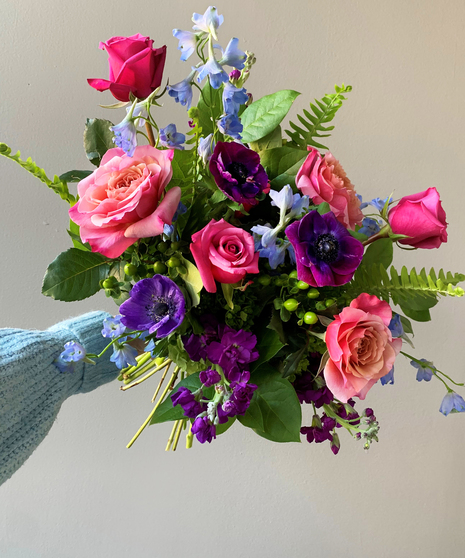 Cloud colors at sunset with pops of fresh spring green, featuring eye-popping garden roses and whimsical blooms floating throughout. Designed as a beautiful wrap, ready to drop in your vase - order same day delivery today!