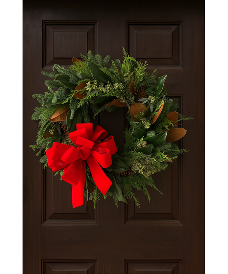 Our traditional evergreen wreath is a celebration of the winter season! Crafted from a fragrant wintergreen wreath base, it’s blended with seeded eucalyptus, magnolia tips and pinecones and YOUR CHOICE OF: a perfectly accented large or small red velvet ribbon ribbon or simply no ribbon at all! Adorn your door or gift to someone special!