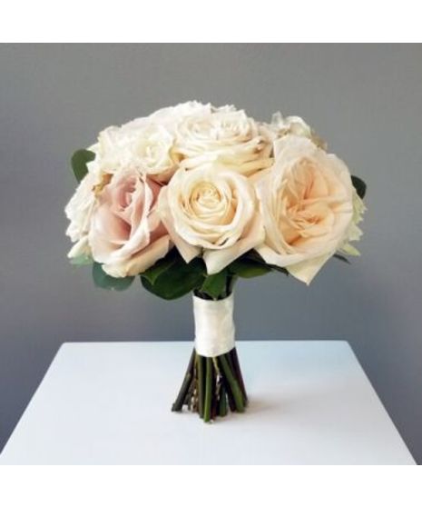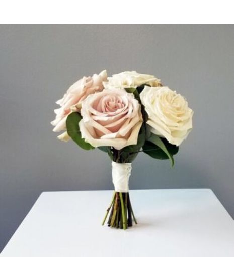 A gorgeous classically styled bouquet featuring a blend of cream and blush roses, vibrant greenery, and other textures, hand-tied with a ribbon wrapped stem. Perfect for destination weddings, courthouse surprises, and romantic elopements.(No Vase Included)